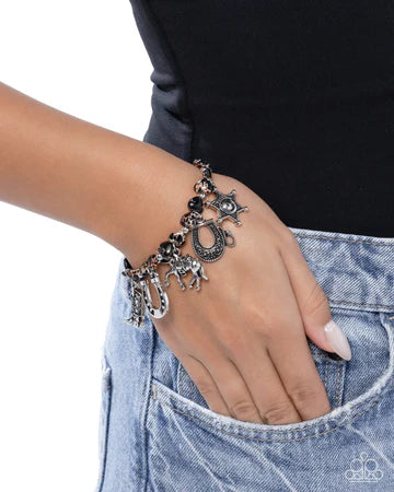 A collection of black marbled stone hearts is paired with a series of silver western-inspired charms, including a cowboy boot, horseshoe, a saddled horse, a stirrup, and a detailed sheriff badge. Features an adjustable clasp closure. As the stone elements in this piece are natural, some color variation is normal.