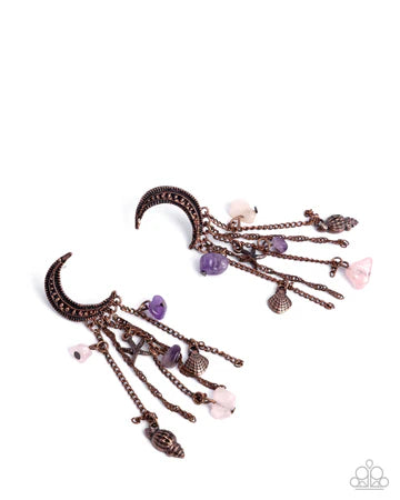 Dangling from a textured copper crescent moon, an array of copper chains adorned with natural stone-like beads, seashell charms, and textured accents sway from the ear in a celestial vibe. The cascading elements create dynamic movement and a bohemian aesthetic, perfect for adding a touch of enchantment to your outfit. Earring attaches to a standard post fitting.