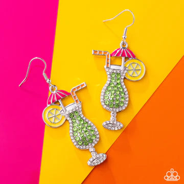 Featuring an orange-painted straw, a pink-painted umbrella, and a yellow-painted lemon, a green rhinestone tropical drink poured in a white rhinestone-bordered glass cascades below the ear for a beachside blingy display. Earring attaches to a standard fishhook fitting.