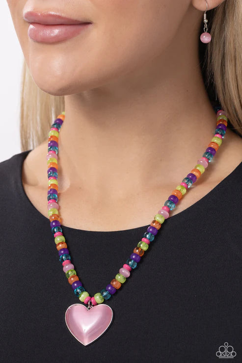 Stretched across an invisible wire, multicolored beads, featuring various opacities and sheens, coalesce around the collar. An oversized pink cat's eye stone in a silver heart frame swings from the bottom of the multicolored display, creating an earthily endearing pendant. Features an adjustable clasp closure.