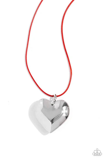 An oversized, sleek silver heart glides along a vibrant red cord, creating a flirtatious pendant below the collar. Features an adjustable clasp closure.
