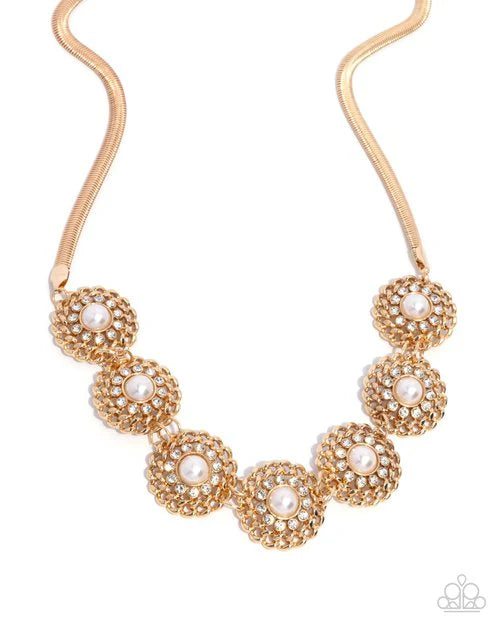 Connecting to a flat gold snake chain, layers of white rhinestones in gold fittings and gold curb chains fan out from white pearl-dotted centers, resulting in radiant centerpieces along the neckline for a flashy, flawless look. Features an adjustable clasp closure.