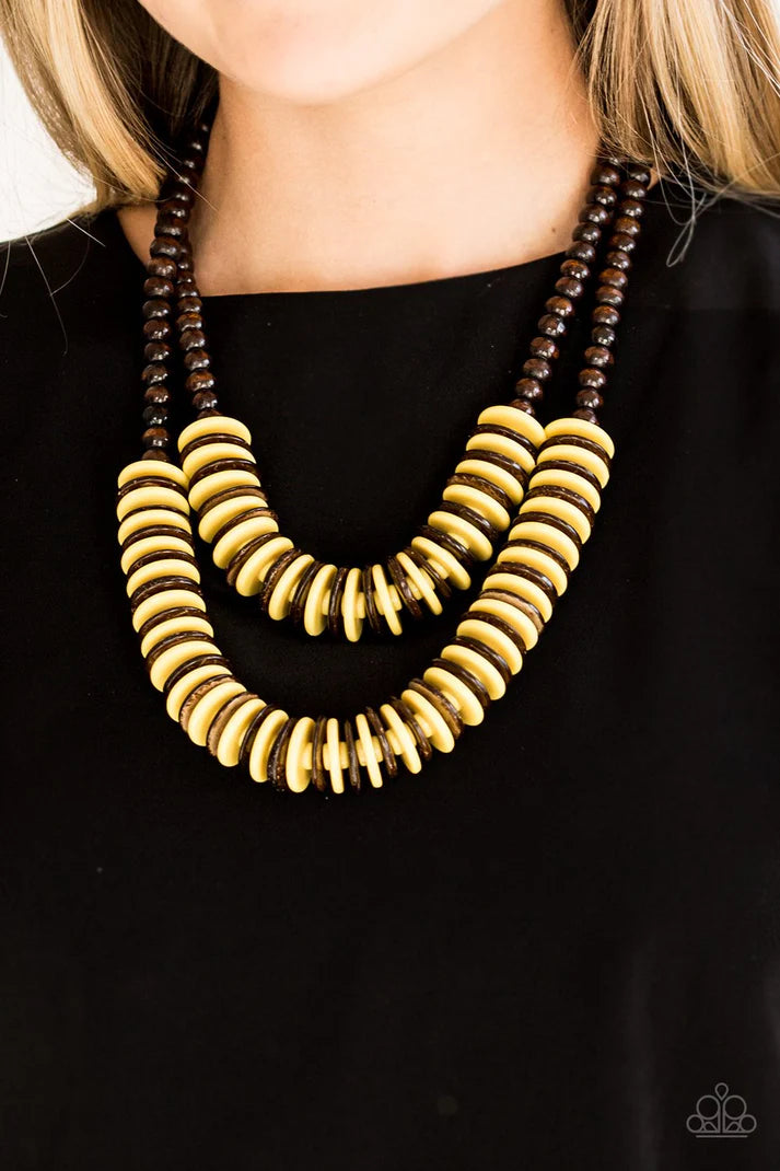 Brown wooden beads give way to rows of yellow and brown wooden discs, creating colorful layers for a summery look. Features a button-loop closure.