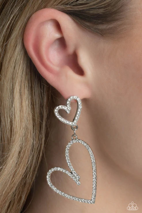 An oversized, rhinestone-encrusted shiny silver heart silhouette hangs from a smaller heart silhouette set in the same blinding shimmer for a romantic, eye-catching sparkle. Earring attaches to a standard post fitting.