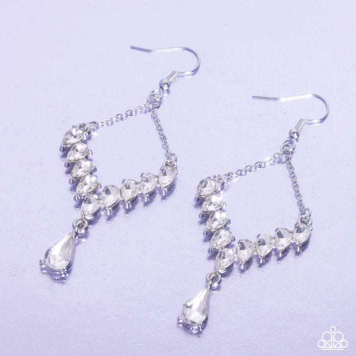 Suspended from dainty silver chains, a collection of upside-down white gem teardrops are pronged into a diamond-shaped frame below the ear, giving way to a solitaire teardrop white gem for a dramatic, dazzling fringe. Earring attaches to a standard fishhook fitting.