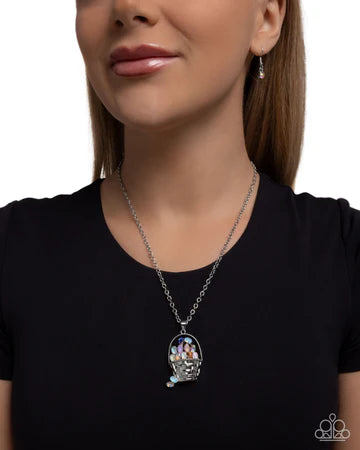 A dainty silver chain suspends a whimsical pendant in the shape of a woven silver basket, brimming with multicolored iridescent rhinestones resembling Easter eggs. A delicate duo of eggs gracefully sit beside the basket, adding a charming touch to this playful design. Features an adjustable clasp closure. Due to its prismatic palette, color may vary. Sold as one individual necklace. Includes one pair of matching earrings.