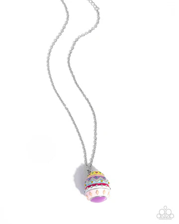 A whimsical Easter egg-shaped pendant featuring vibrant pastel hues and intricate patterns dangles from a simple silver chain, creating a playful and artistic look. Accents of purple, pink, and yellow paired with raised silver details, dainty multicolored and iridescent rhinestones, and a glossy finish bring the pendant to life, perfect for adding a touch of charm to any outfit. Features an adjustable clasp closure.