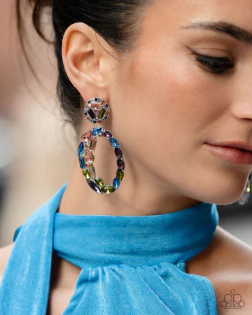 Exploding with a multicolored motley of round and emerald-cut gems, a circular silver post, bordered in additional multicolored rhinestones gives way to an abstract, thick oval frame made up of pronged multicolored gems in round, marquise-cut, teardrop, and emerald-cuts for an elegantly eclectic display. Earring attaches to a standard post fitting.