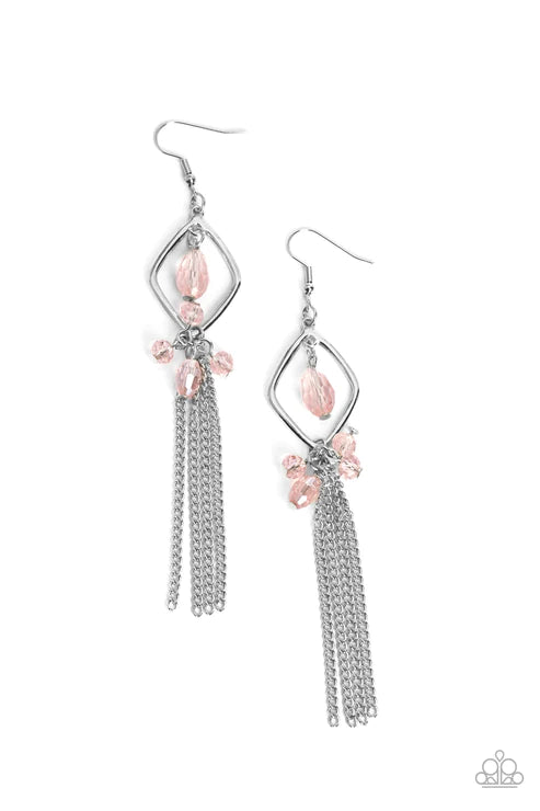 A glassy, faceted, teardrop-shaped bead in a subtle pink shade swings from the top of a silver, diamond-shaped frame. A cascade of silver chains falls from the bottom point of the frame, accompanied by a cluster of opaque beading in a muted pink tone and another smaller glass bead that matches the one swinging above. Earring attaches to a standard fishhook fitting.