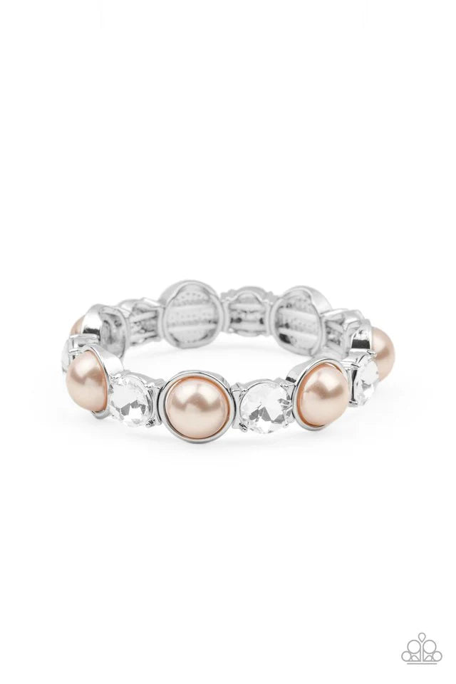 Featuring sleek silver fittings, bubbly brown pearls, and oversized white rhinestones delicately threaded along stretchy bands for a refined flair. This elegant Paparazzi Bracelet in brown is a must-have accessory for any sophisticated ensemble.