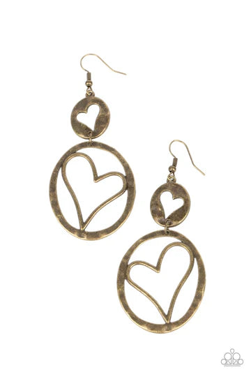 Hammered in an antiqued sheen, a collection of interconnected brass discs sporting hearts, dangles from the ear. The larger, airy, hammered disc features an oversized, asymmetrical heart filling up its center. Earring attaches to a standard fishhook fitting.