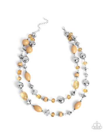 Two strands of tranquil light brown and silver beads create a sophisticated layered look. The design features a mix of translucent, opaque, and metallic beads in various shapes, including round, oval, and faceted elements, adding texture and depth. The soft brown hues are complemented by the polished silver tones, making this design a versatile addition to any wardrobe. Features an adjustable clasp closure.