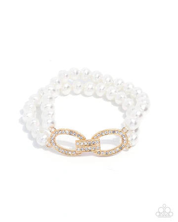 Infused along elastic stretchy bands, a duo of glossy white pearls connects to crystal-like white rhinestone-embellished airy gold ovals held together by a stacked gold pendant also embellished in glistening white rhinestones for a lovely, luminescent centerpiece atop the wrist.