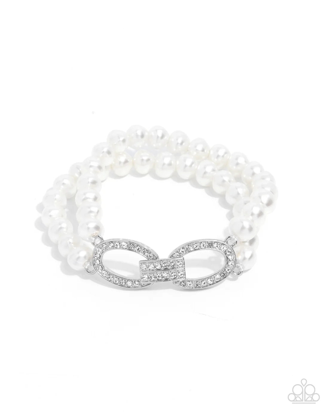 Infused along elastic stretchy bands, a duo of glossy white pearls connects to crystal-like white rhinestone-embellished airy silver ovals held together by a stacked silver pendant also embellished in glistening white rhinestones for a lovely, luminescent centerpiece atop the wrist.