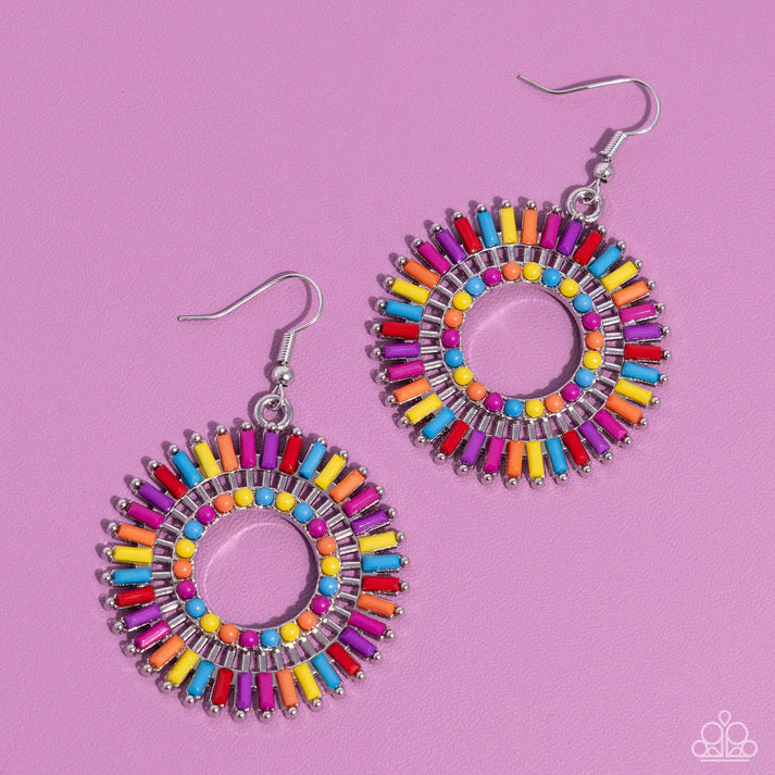 Featuring bright red, purple, yellow, orange, Rose Violet, and turquoise colors, round beads adorn the inner circle of a whimsical silver studded frame, while emerald-cut beads in the same shades encrust along the outer curve of the hoop for a spinning display of color. Earring attaches to a standard fishhook fitting.