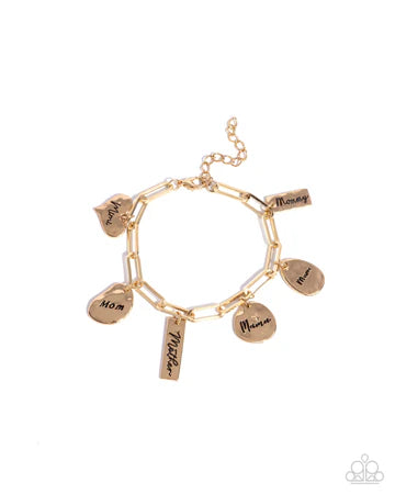 Dancing along a gold paperclip chain, a collection of slightly hammered gold pendants in varying shapes feature the word "mom" in a variety of ways along the wrist for a magical Mother's Day-inspired look. Features an adjustable clasp closure.