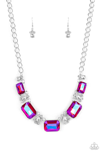 Featuring a stellar UV finish, an oversized collection of emerald cut pink rhinestones link with white rhinestone dotted teardrop rhinestone frames below the collar for a jaw-dropping display. Features an adjustable clasp closure.