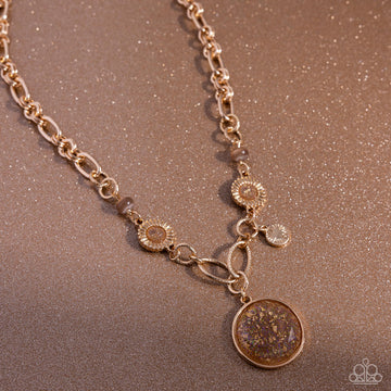 Interlocking below the neckline, textured gold links join elongated gold links, leading the eye to brown cat's eye beads, brown iridescent-flecked sunburst-textured pendants, coiled gold ovals, sunburst textured discs, and an oversized iridescent shell-flecked brown pendant for a dazzling, dimensional centerpiece. Features an adjustable clasp closure.