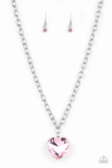Set atop a sleek silver fitting, a glittery pink heart-shaped gem swings from the bottom of a classic silver chain below the collar for a whimsical look. Features an adjustable clasp closure.