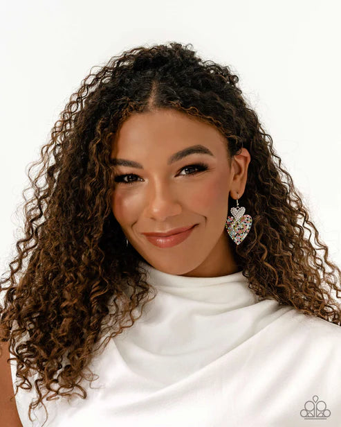 Embossed in dainty rhinestones, a white rhinestone-covered silver heart frame delicately links with a larger silver heart frame featuring white, light pink, blue, purple, and olive green rhinestones for a flirtatiously vibrant look. Earring attaches to a standard fishhook fitting.