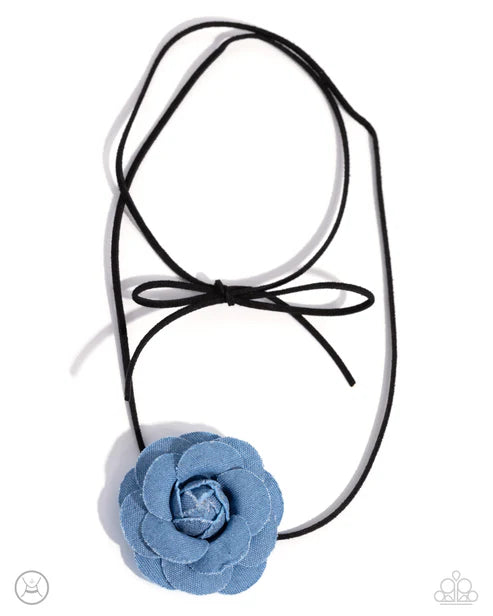 Featuring tactile detail, a three-dimensional, oversized denim rose slides along strips of black suede, creating a Western floral-inspired centerpiece around the collar. Features an adjustable clasp closure.