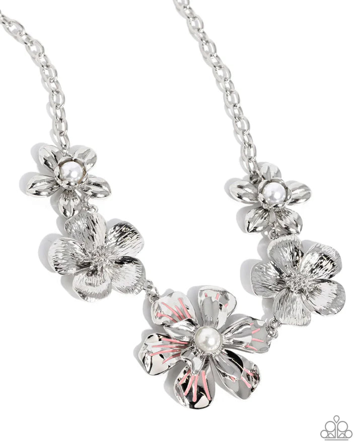 Featuring glassy white pearl centers, high-sheen silver-petaled flowers alternate with highly-serrated silver flowers below the collar for a fierce floral fashion. The larger pearl-centered silver flower featuring stripes of Burnt Coral adds a feminine finish to the design. Features an adjustable clasp closure.
