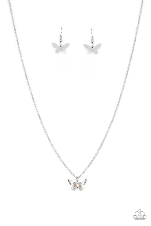 Layered with ornate silver wings, an iridescent rhinestone dotted butterfly flutters from a dainty silver chain below the collar for a whimsical fashion. Features an adjustable clasp closure.