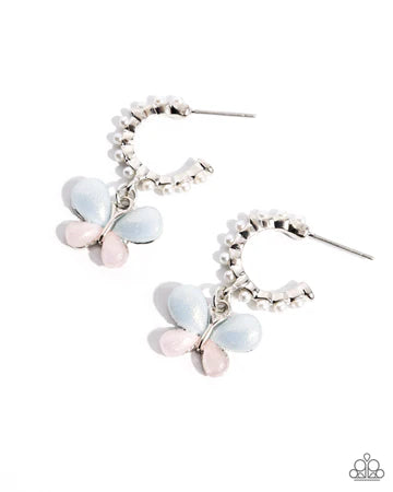 Pressed in a scalloped silver fitting, white pearls curl around the ear for a refined fashion giving way to a silver butterfly with blue and baby pink sparkly resin wings for a whimsically sophisticated look. Earring attaches to a standard post fitting. Hoop measures approximately 5/8" in diameter.