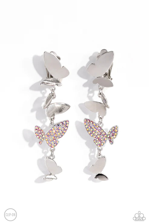 Three butterflies with high-sheen silver wings and one pink iridescent-encrusted butterfly flutter down the ear, creating a free-spirited lure. Each butterfly swings in whimsical asymmetry, creating the look of butterflies flying in alternating directions. Earring attaches to a standard clip-on fitting. Due to its prismatic palette, color may vary.