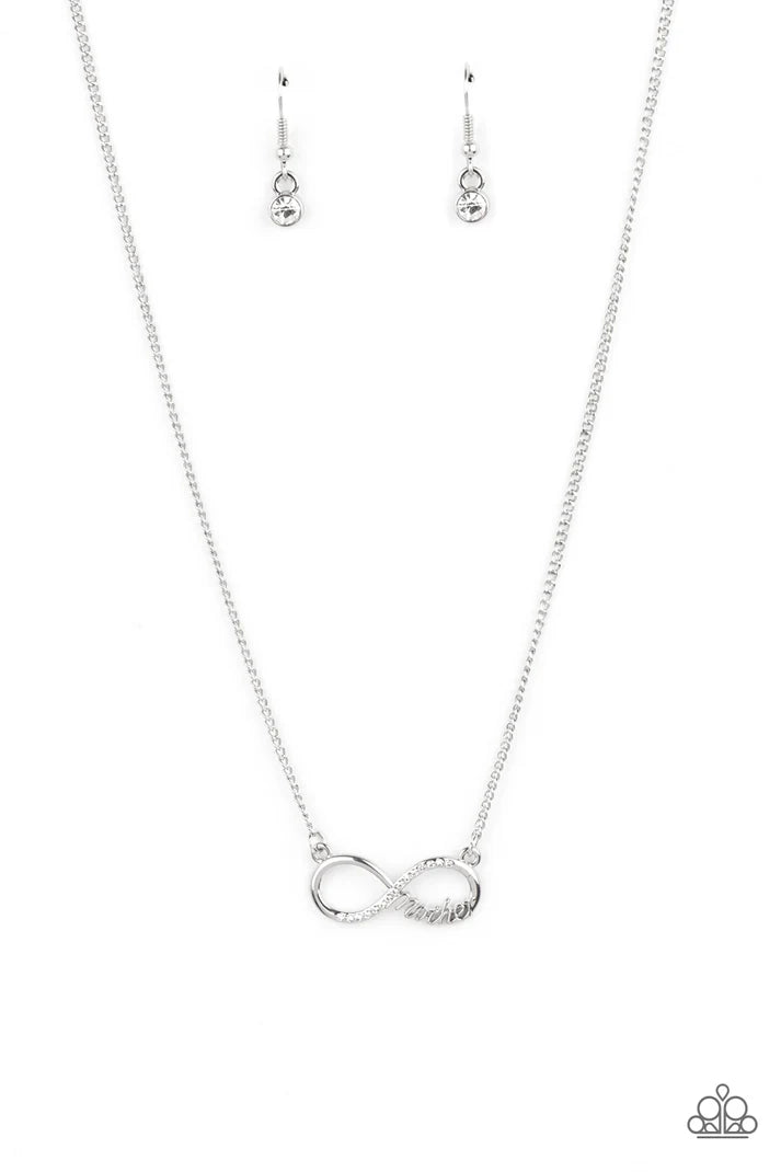 A bright silver infinity symbol features the word "Mother" in filigree script across the bottom. A row of sparkly dainty rhinestones travels across the curve creating a lovingly charming sentiment as it connects to a dainty silver chain below the collar. Features an adjustable clasp closure.