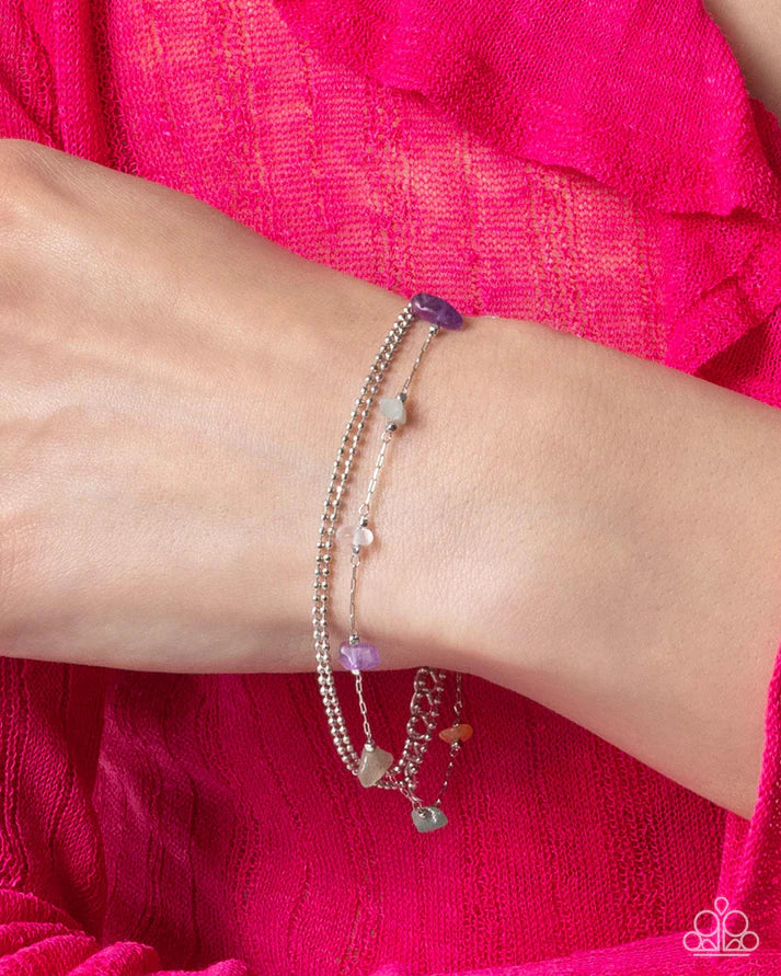 A mismatched collection of dainty silver chains including ball chains and a paperclip chain layer and stack around the wrist. Infused along the paperclip chain, a collection of chiseled amethyst, jade, gray, and orange stones standout for an earthy, eclectic display. Features an adjustable clasp closure. As the stone elements in this piece are natural, some color variation is normal.