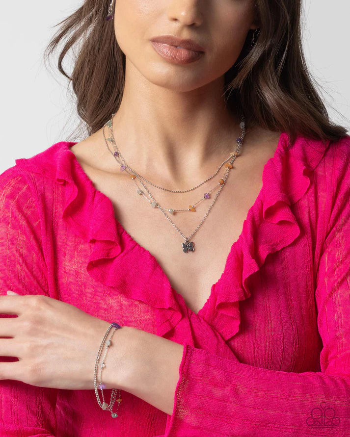 A mismatched collection of dainty silver chains including a ball chain, a paperclip chain, and a classic chain layer and stack below the neckline. Infused along the paperclip middlemost chain, a collection of chiseled amethyst, jade, and orange stones join a silver butterfly that glides along the lowermost chain for an earthy, eclectic display. Features an adjustable clasp closure. As the stone elements in this piece are natural, some color variation is normal. Sold as one individual necklace. Includes pair of matching earrings.