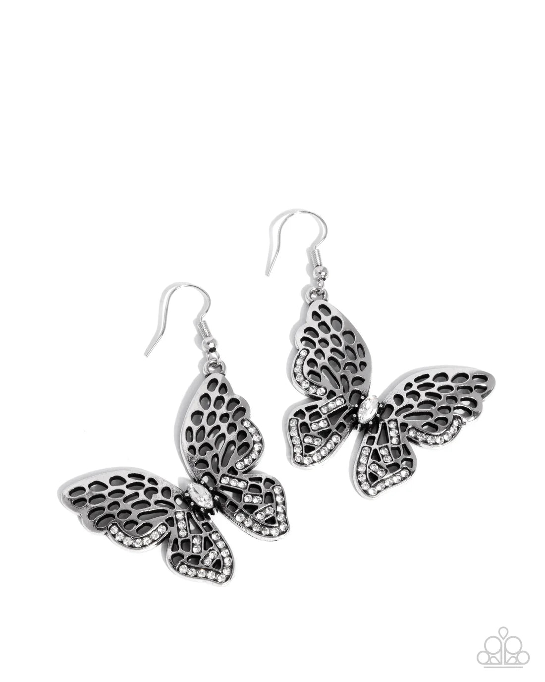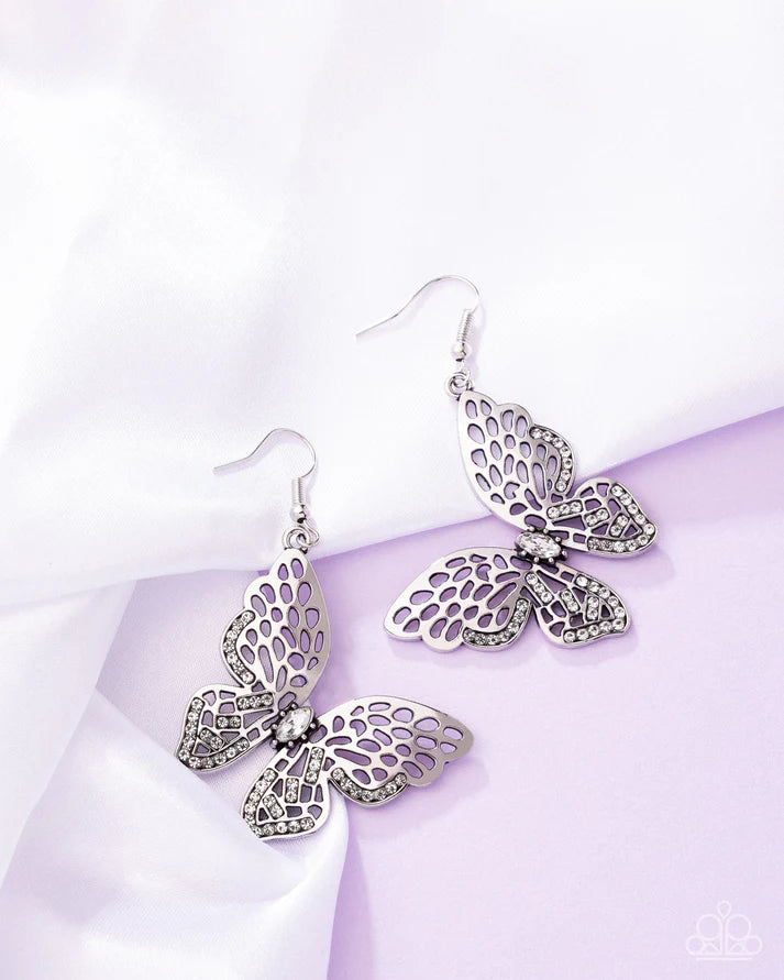 Dotted with dainty white rhinestones, an airy elaborate silver butterfly flutters below the ear for a whimsical display. A silver-pronged marquise-cut white gem creates the butterfly's body for additional timeless twinkle. Earring attaches to a standard fishhook fitting.