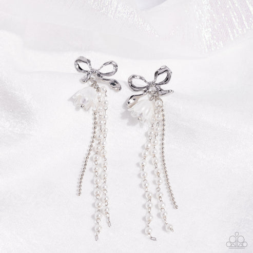 A high-sheen silver bow gives way to a collection of dainty white pearls, a strand of silver ball chain, and a pearlized tulip for an enchanting, elegant array. Earring attaches to a standard post fitting.