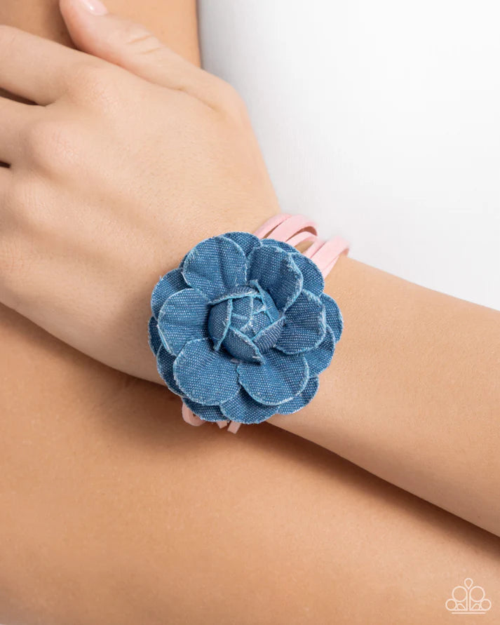 Featuring tactile detail, a three-dimensional, oversized denim rose slides along strips of thin pink suede, creating a Western floral-inspired centerpiece around the wrist. Features an adjustable clasp closure.