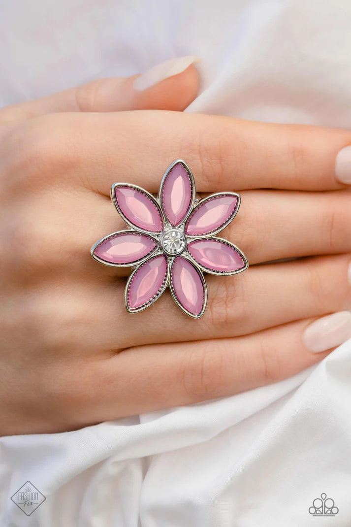 Glassy marquise-cut petals in a dreamy orchid hue, fan out around a sparkling white gem center, creating a vibrant, oversized flower that sits prominently atop the finger. Features a stretchy band for a flexible fit.