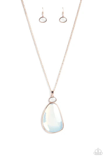 Pressed in abstract rose gold frames, an opalescent, oversized, white acrylic piece and milky oval acrylic piece drips from the bottom of an elongated rose gold chain for a basic geometric design. Features an adjustable clasp closure.