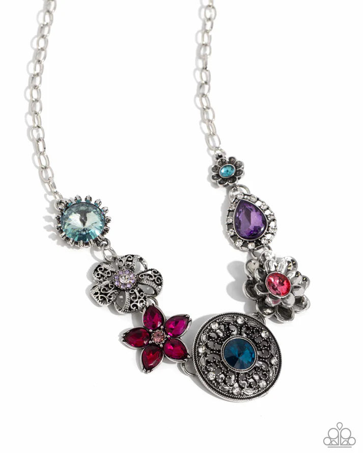 A variety of floral-inspired pendants featuring intricate detailing encircle the collar, creating a glitzy display. Various silver flowers featuring colorful gem centers and petals fan out, followed by an airy silver filigree flower with a glistening rhinestone center. Two faceted round and teardrop gems in various shades are encircled by classic white rhinestones and studded texture. A burst of silver filigree and white rhinestones radiates from a blue gem, creating the centermost, large pendant for a whimsical finish. Features an adjustable clasp closure.