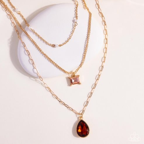 Featuring three refined motifs, three shimmery gold chains layer below the chest. Glossy white pearls are infused along the uppermost gold cable chain above a solitaire-pronged emerald-cut peach gem that glides along a classic gold chain. Pressed in a gold teardrop frame, an oversized tea gem glides along the lowermost gold paperclip chain for a majestic vibe.