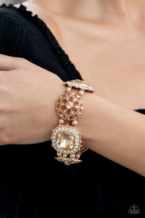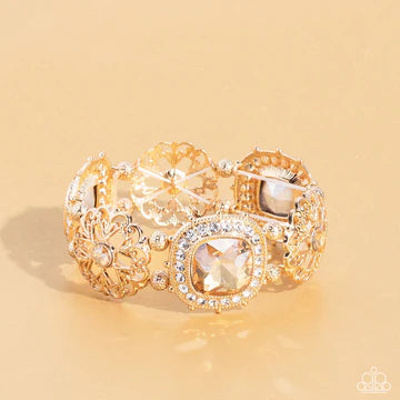 Oversized faceted golden gems in dramatically rounded square cuts are wrapped in borders of classic white rhinestones, emitting a breathtaking sheen. Floral-inspired frames, dotted with solitaire golden rhinestones, bloom in between the large rhinestones, adding airy accents to the bold design, as textured gold beads separate each frame as they're threaded along stretchy elastic bands.