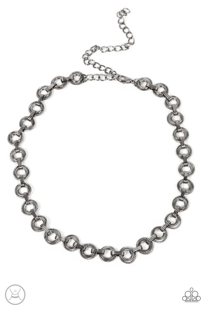 Dainty pairs of textured gunmetal hoops and rings link with pinched gunmetal fittings around the neck, resulting in a gritty vibe. Features an adjustable clasp closure.