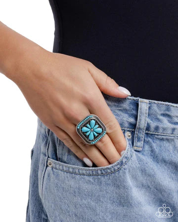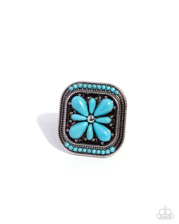 Chiseled into a tranquil rounded square, various sizes of refreshing teardrop-cut turquoise stones are pressed into a daintily studded silver frame around a central silver stud, creating an earthy flower atop the finger. A collection of dainty additional turquoise stone beads rest along the top and bottom curvature of the frame for a seasonal finish. Features a stretchy band for a flexible fit. As the stone elements in this piece are natural, some color variation is normal.