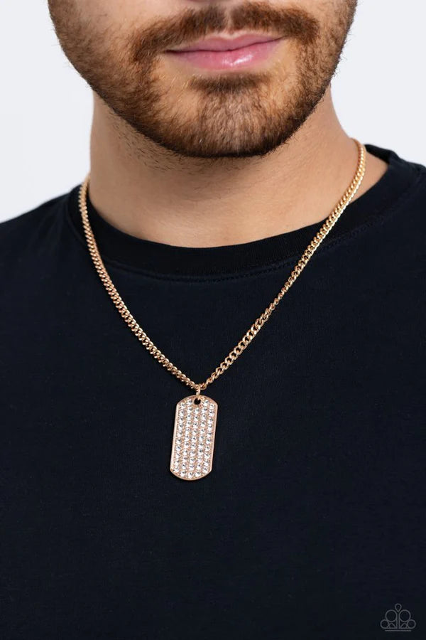 Adorned with shimmering rows of brilliant white gems, this luxurious gold dog tag pendant gracefully moves along an extended classic gold chain, creating an effortlessly chic and industrial-glam look. The pendant's captivating sparkle catches the light beautifully, while the adjustable clasp closure ensures a customizable fit, making it perfect for any occasion. Elevate your jewelry collection with this stunning piece.