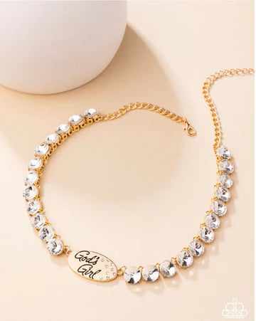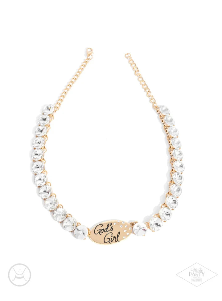 Infused along a classic gold chain, a flashy collection of gold-pronged white gems shimmer and shine down the neckline to an oval gold plate. The phrase "God's Girl" is stamped in a curly font on the plate beside a dusting of dainty white rhinestones for an inspirational finish. Features an adjustable clasp closure. Sold as one individual choker necklace. Includes one pair of matching earrings. Choker ENCORE This Pink Diamond Encore is back in the spotlight at the request of our 2024 Life of the Party member with Pink Diamond Access, Emily B.