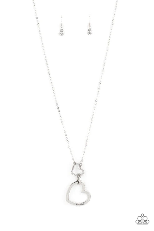 A silver heart engraved with the word "Grandma," dangles from two smaller hearts at the bottom of a lengthened silver chain. The first heart is accented with sparkly white rhinestones creating an affectionately sentimental pendant. Features an adjustable clasp closure.