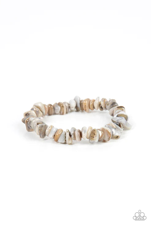 An earthy assortment of natural pebble-like stones are threaded along a stretchy band around the wrist, resulting in a grounding pop of color.