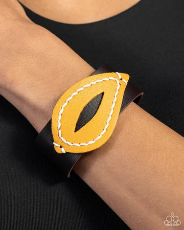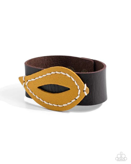 A leathery yellow leaf frame is stitched in place across the front of a brown leather band, resulting in a seasonal centerpiece around the wrist. Features an adjustable snap closure.