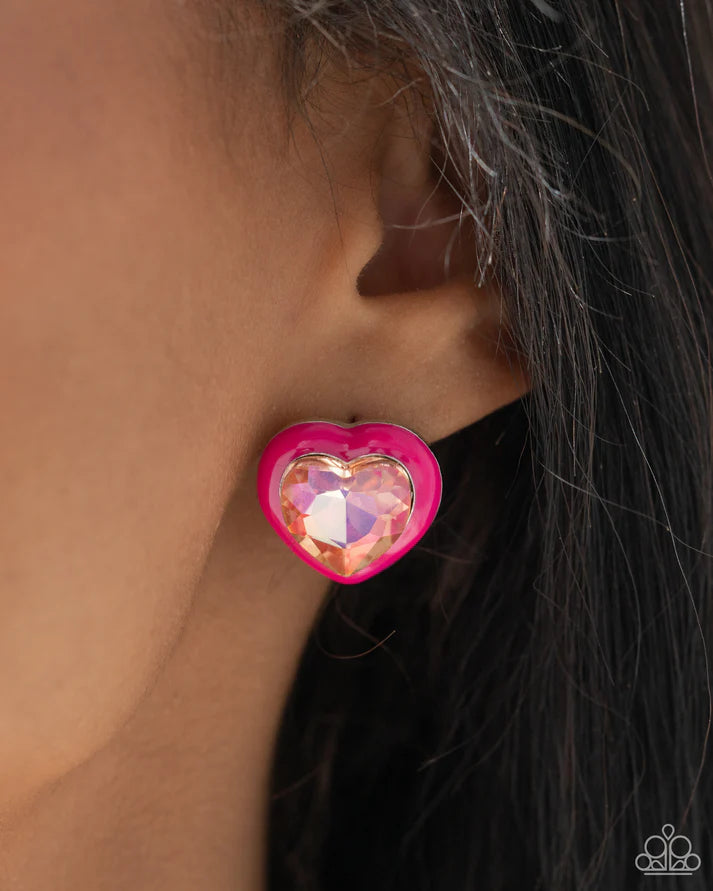 Pressed in a border of Pink Peacock paint, an oversized UV shimmery heart gem glimmers from the ear, resulting in a romantic-inspired display. Earring attaches to a standard post fitting.
