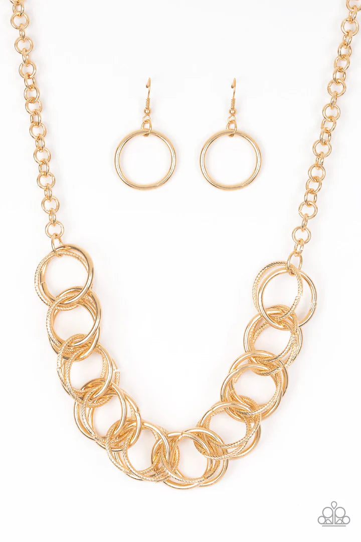 Smooth and serrated gold rings interlock below the collar for a bold statement. Features an adjustable clasp closure.