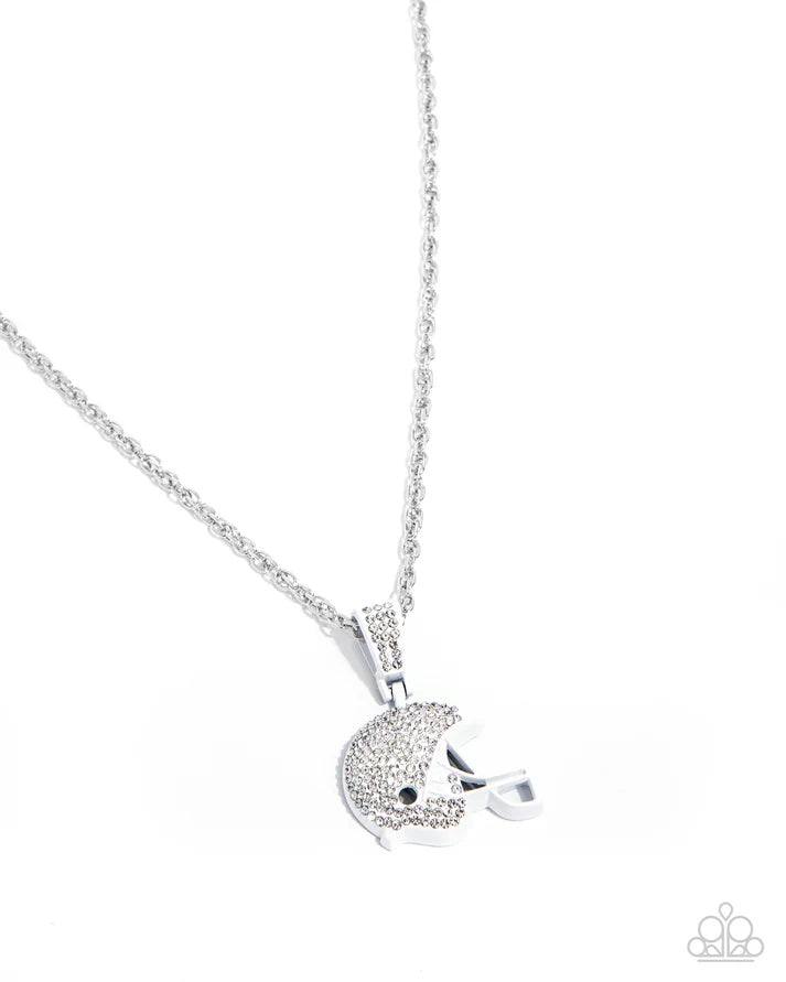 Featuring an explosion of glistening white rhinestones, a white-painted bail clasp connected to a white-painted football helmet also embellished in white rhinestones glides along a classic silver chain for a shimmery, sporty look. Features an adjustable clasp closure.